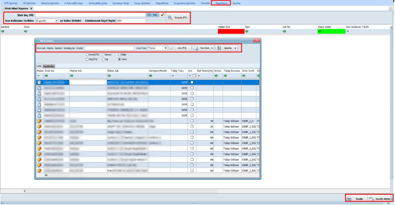 Stok Seç: "Seç" kısmından stok listesi açılır. Sorgulamak istenen ürün seçildikten sonra, "Sorgula" butonuna tıklanarak ilgili bilgilere ulaşılabilir. Miad durumu ekranı, stoğunuzda bulunan ürünlerin miad tarihlerini gösterir. Son kullanma tarihi geçmiş ürünler siyah renkte, 7 günden az kalan ürünler kırmızı renkte, 30 günden az kalanlar ise sarı renkte görüntülenir.