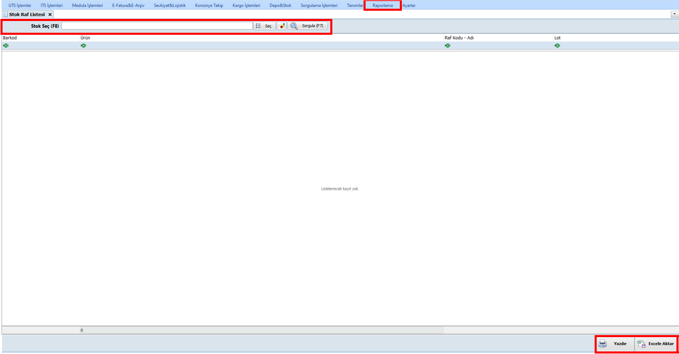 'Stok Seç' alanından ürün seçildikten sonra, 'Sorgula' butonuna tıklanır.