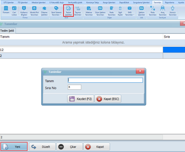 - Yeni: "Yeni" seçeneği tıklanarak yeni bir teslim şekli tanımlanır.