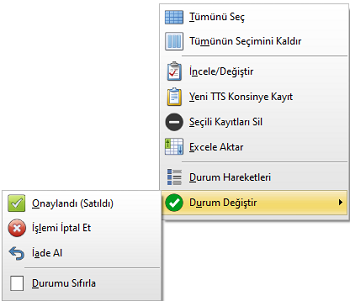 - Durum Değiştir: Bu seçenek, işlemin durumunu değiştirmek için kullanılır. Aşağıdaki seçeneklerle durumu güncelleyebilirsiniz: