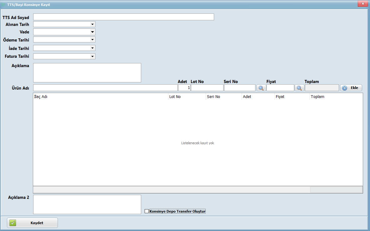 - Kaydet: Tüm girilen bilgiler doğrultusunda konsinye kaydı tamamlanır.