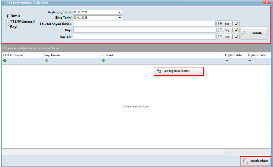- Excel’e Aktar: Listelenen sonuçları Excel formatında dışa aktarmak için "Excel’e Aktar" düğmesi kullanılır.