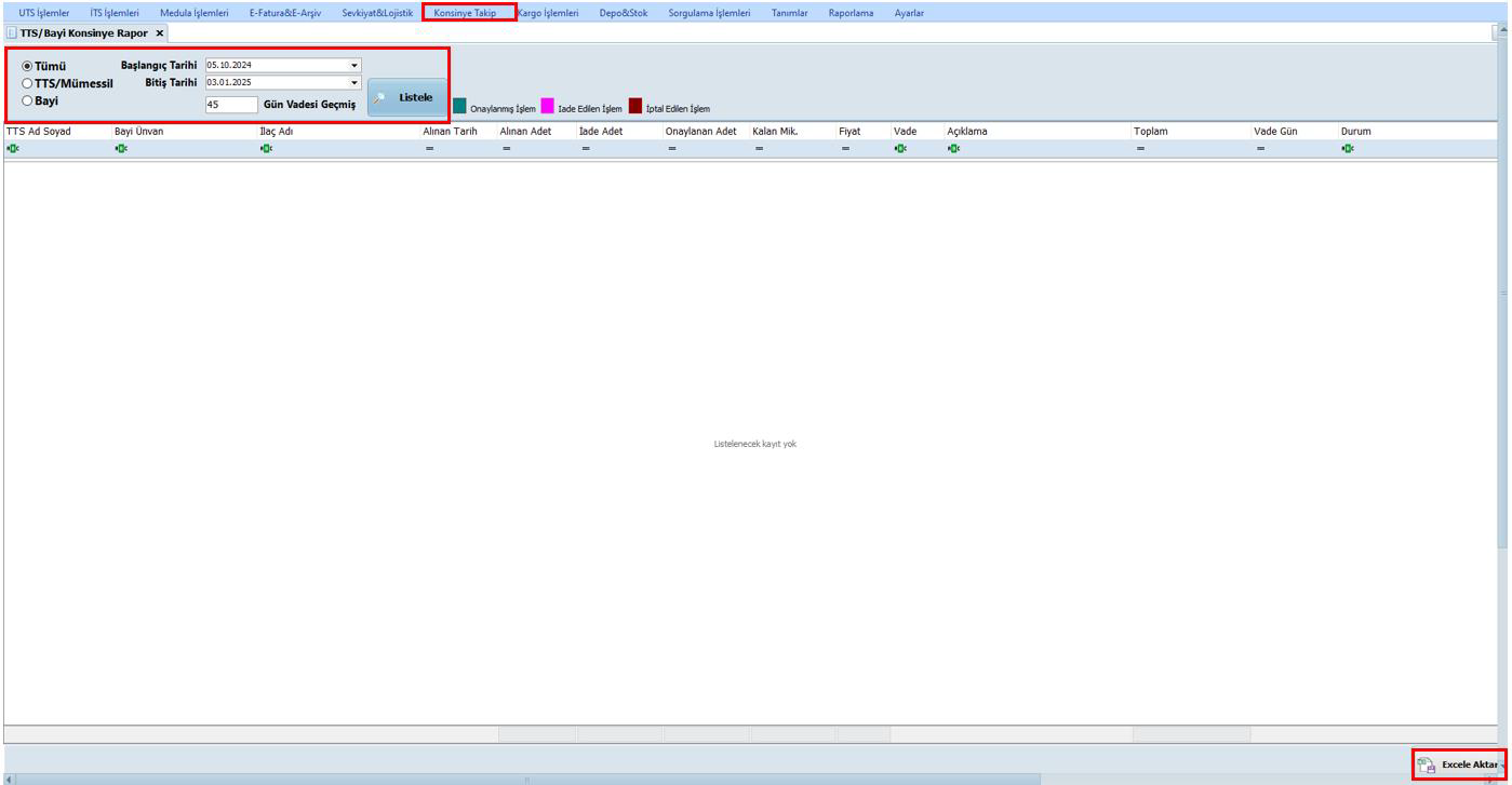 - Bayi: Bayilere ait konsinye işlemleri görüntülenebilir. Gün Vadesi Geçmiş: Bu filtre, vadesi geçmiş olan işlemleri seçmek için kullanılır. Bu sayede, ödeme süresi dolmuş ve hala gerçekleşmemiş işlemler ayrı bir şekilde raporlanabilir. Listeleme: Tüm filtreler ve tarih aralığı belirlendikten sonra, işlemi tamamlamak için "Listele" butonuna tıklanır. Bu işlem, belirlenen kriterlere göre raporu oluşturur ve ekranda görüntülenmesini sağlar. Excel’e Aktar: "Excel’e Aktar" butonuna tıklanarak dışa aktarılabilir. Bu işlem, verilerin Excel formatında kaydedilmesini sağlar ve verilerin daha ayrıntılı analizini yapabilmek için kullanılır.