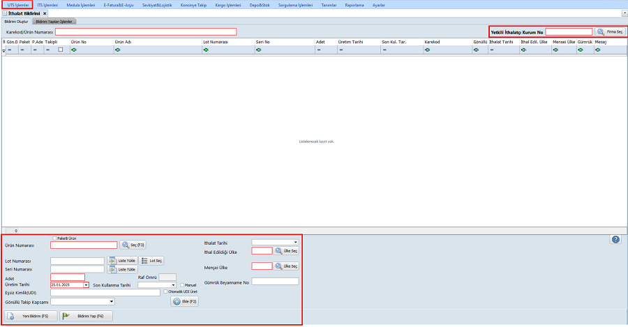 - Lot veya Seri Seçimi: İthalat yapılacak ürünün lot numarası veya seri numarası seçilir.