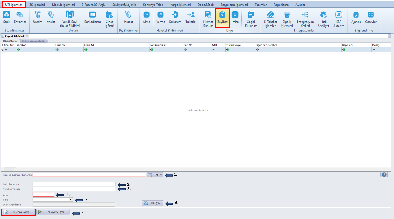 - Zayiat Bildirim Detayı: Zayiat bildirimi ile ilgili tüm detaylı bilgilere ulaşılabilir. Bu, bildirimde belirtilen ürün, adet, lot/seri numarası ve tür gibi bilgileri içerir.