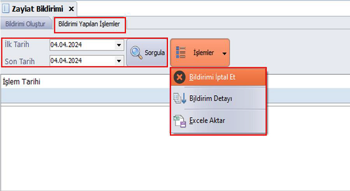 - İşlemler kısmından, zayiat bildirimi ile ilgili tüm detaylara erişim sağlanabilir. Gerekli durumlarda, bildirilen zayiat işlemi iptal edilebilir.