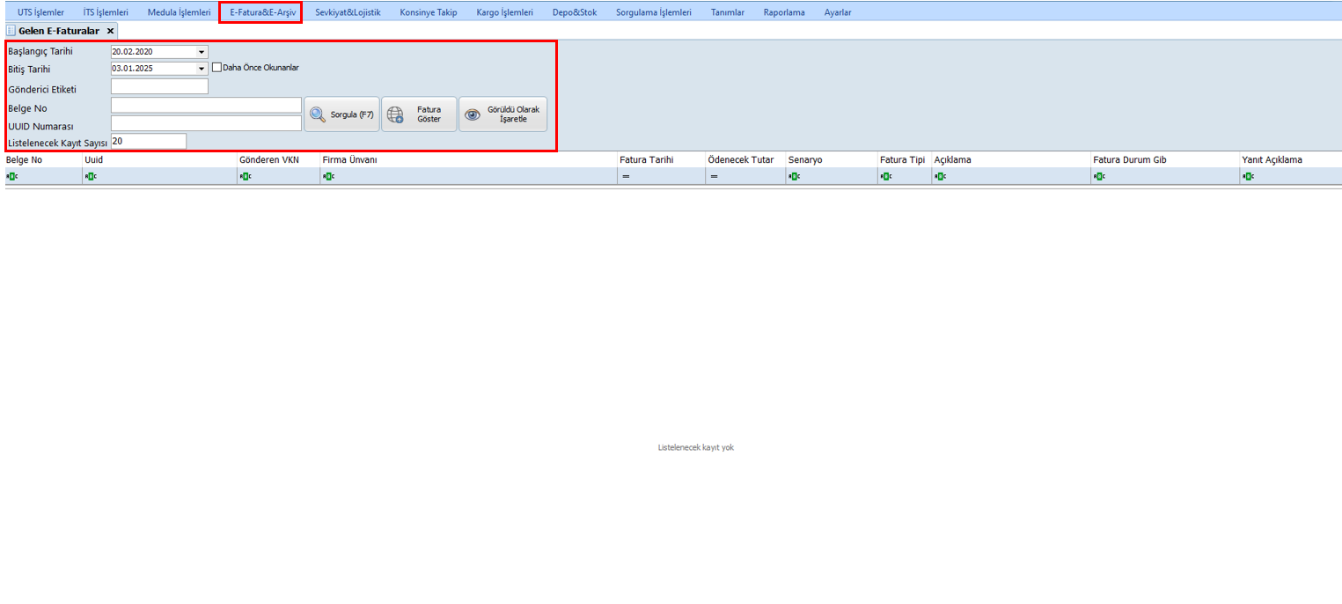 - Gelen E-Faturalar işlemleri, kullanıcıların elektronik ortamda alınan faturaları tarih, gönderici firma, belge numarası gibi kriterlere göre filtreleyerek görüntülemelerini sağlar. Bu işlemler, faturaların hızlı ve düzenli bir şekilde takip edilmesi, yönetilmesi ve kaydedilmesi amacıyla yapılır.