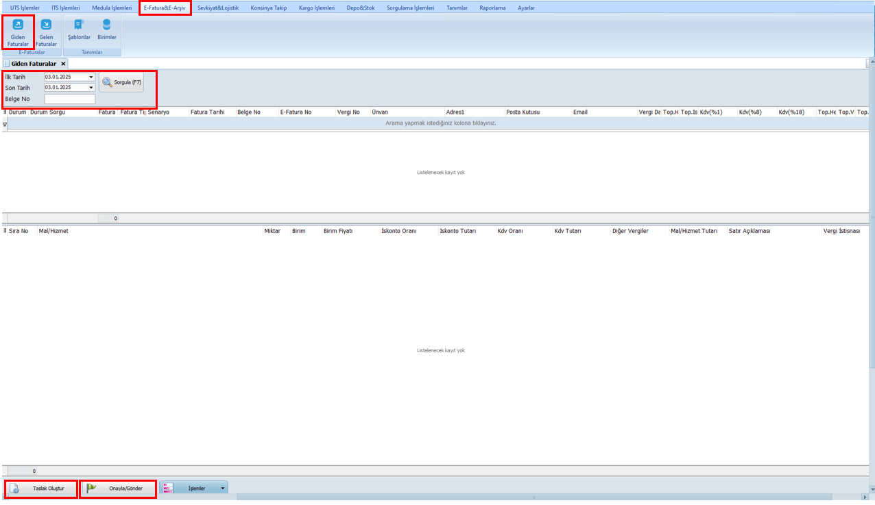 E-Fatura ve E-Arşiv Giden Fatura işlemlerinde, tarih aralığı seçiminin ardından, faturayı belge numarasıyla bulabilirsiniz. Gönderilecek fatura için taslak oluşturulur. İşlemler alanından oluşan taslak fatura kontrol edilir. Bilgilerin doğruluğu teyit edildiğinde Onayla/Gönder seçeneği seçilerek ilgi belge GİB ’e gönderilir.